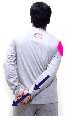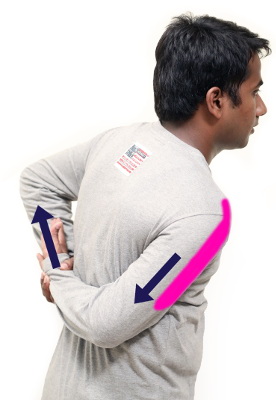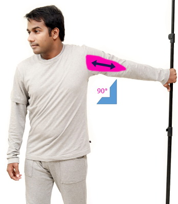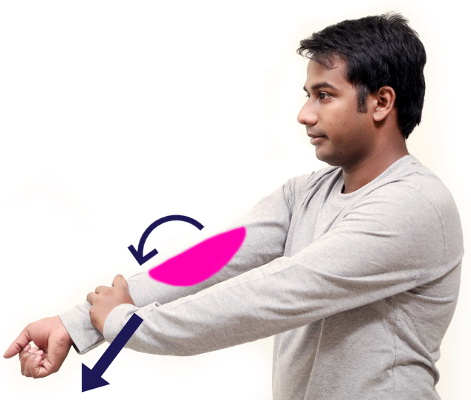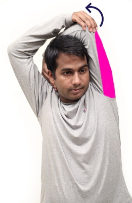 In this video we are going to see coracobrachialis muscle stretching exercise The coloured part of the muscle is being stretched as shown The arrow indicates the direction of stretch